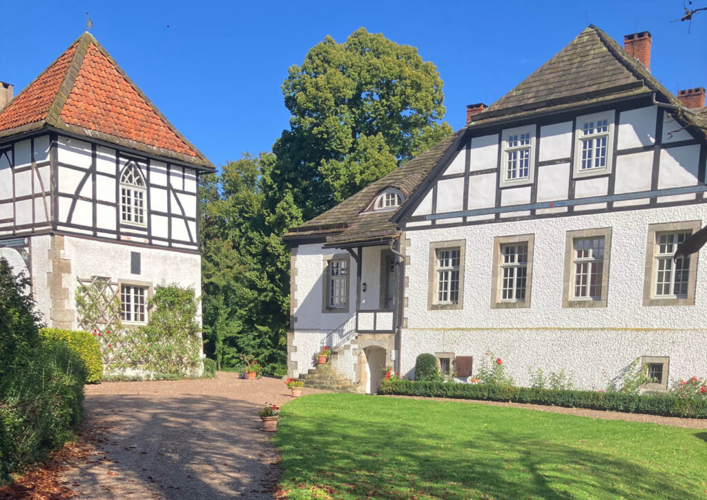 Der Gutshof Abbenburg der Familie von Haxthausen in Brakel-Bellersen, dem „Dorf B.” in Annette von Droste-Hülshoffs Novelle „Die Judenbuche”. Das Nebengebäude Schauplatz der Gerichtsverhandlung um eine unbezahlte Rechnung zwischen dem Juden Soistmann Berend aus dem benachbarten Ovenhausen und seinem späteren Mörder Hermann Winckelhan (in der Novelle Friedrich Mergel). Foto: Literaturlandschaften e.V.